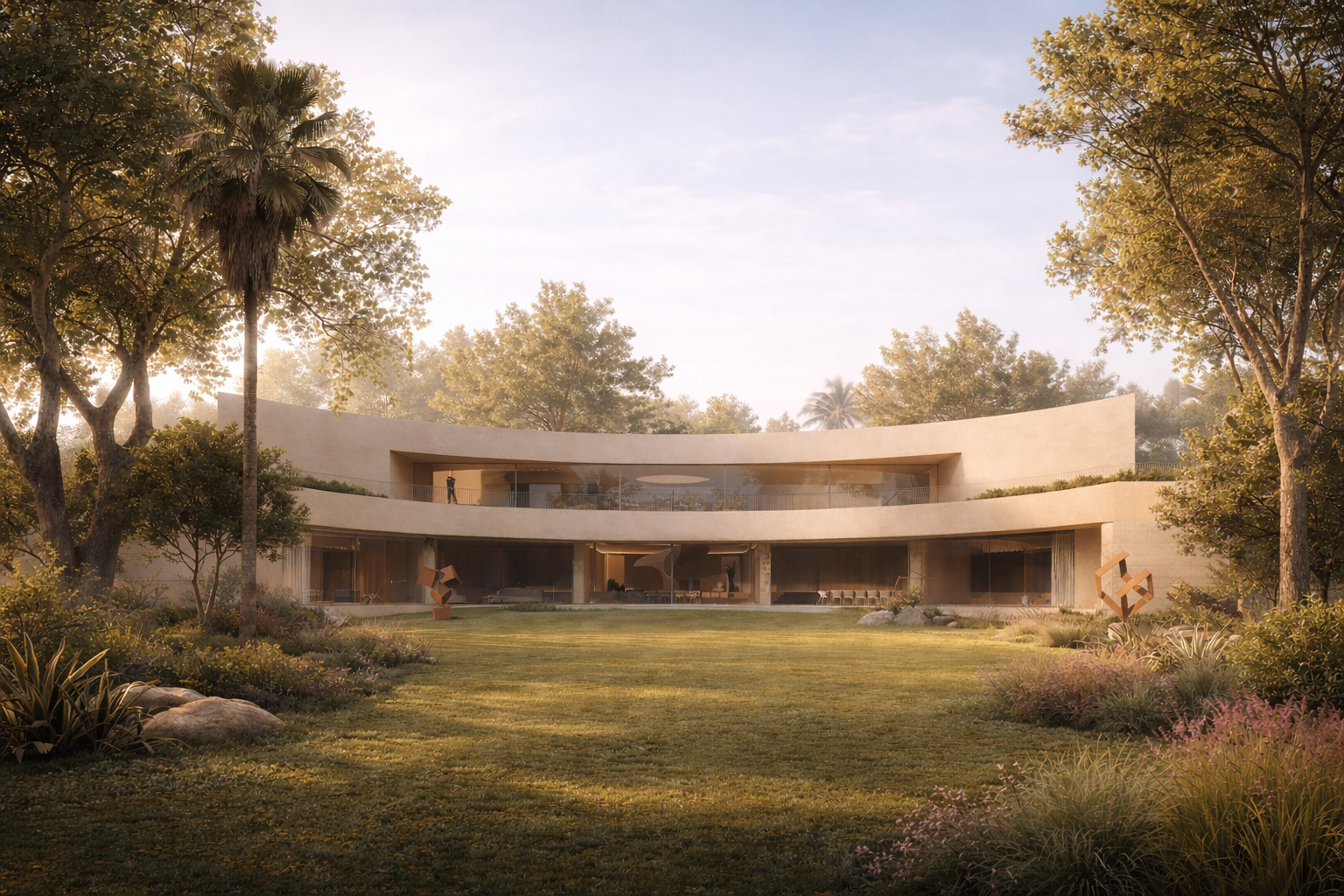 A ceremonial cul-de-sac entrance resolves vehicle access. The concentric curves, emanating from a great tree in the center guide visitors in. They reverberate as they transform into steps that lead up to the main entry, carrying the visitors up to a height from which the rest of the ground floor spaces and gardens gently descend.
