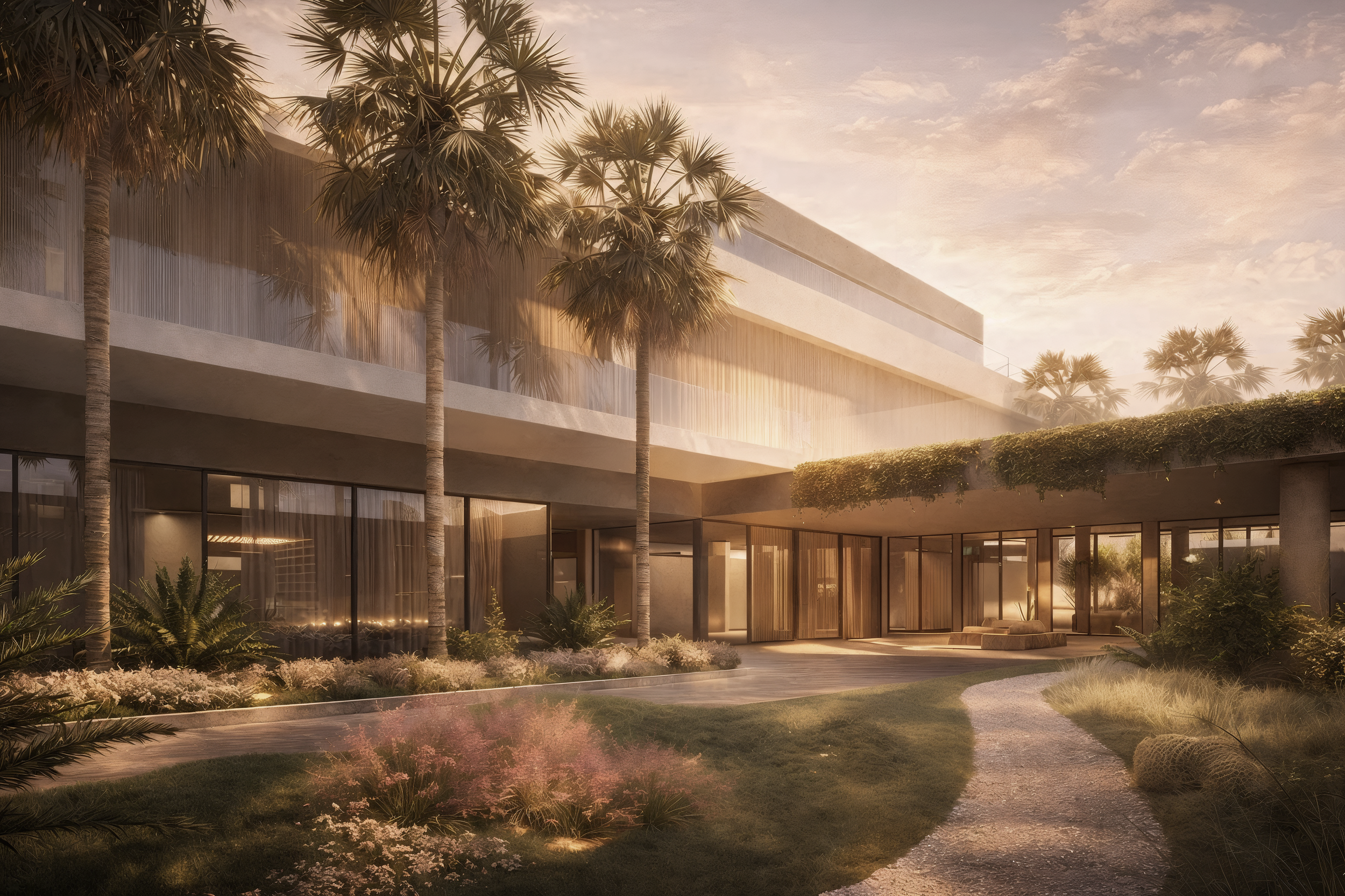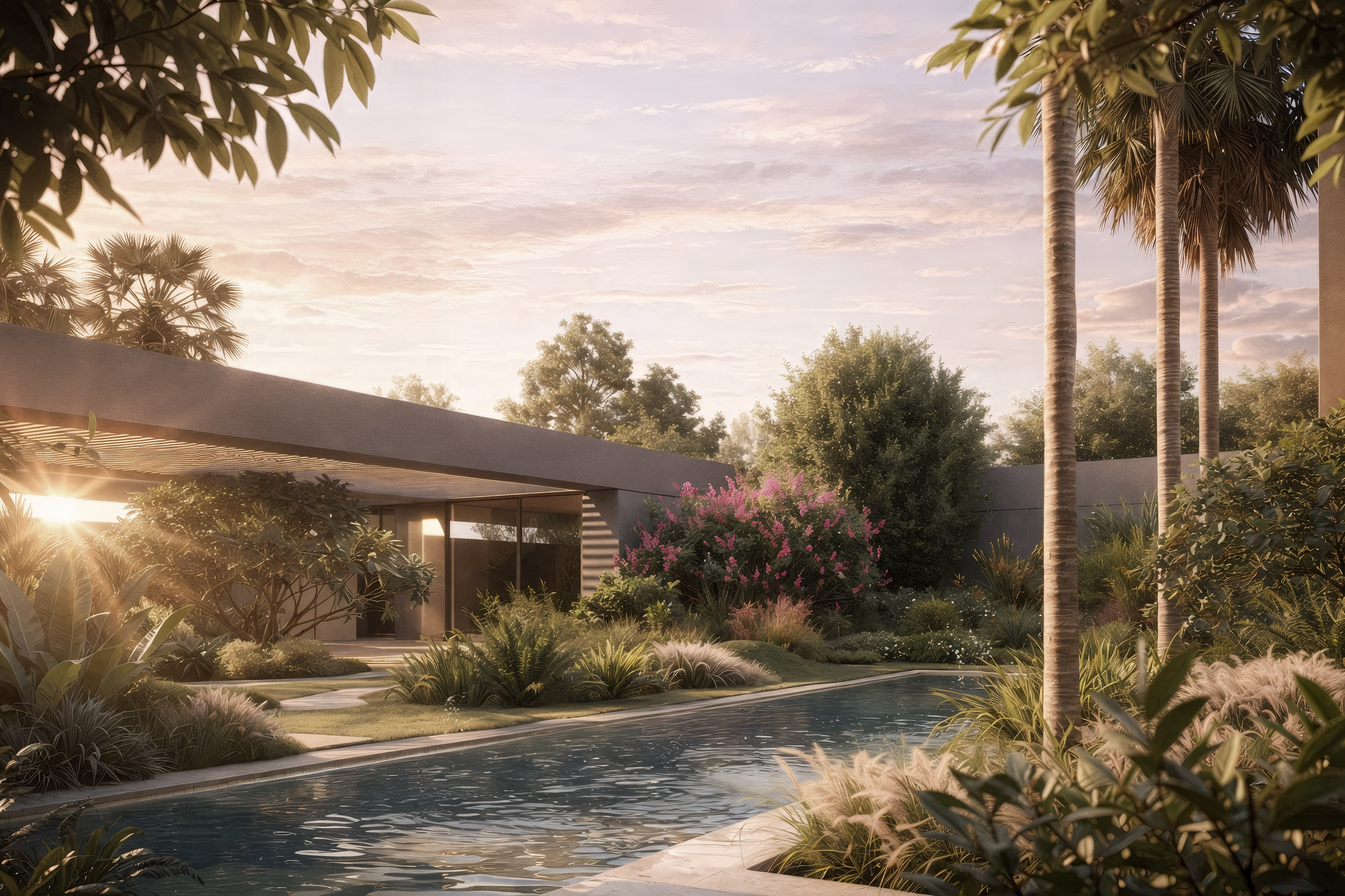 The ground level remains closely tied to the landscape, extending into shaded outdoor spaces and planted thresholds. Above, the upper volumes maintain a more restrained presence, hovering over the garden with controlled openings and filtered light.