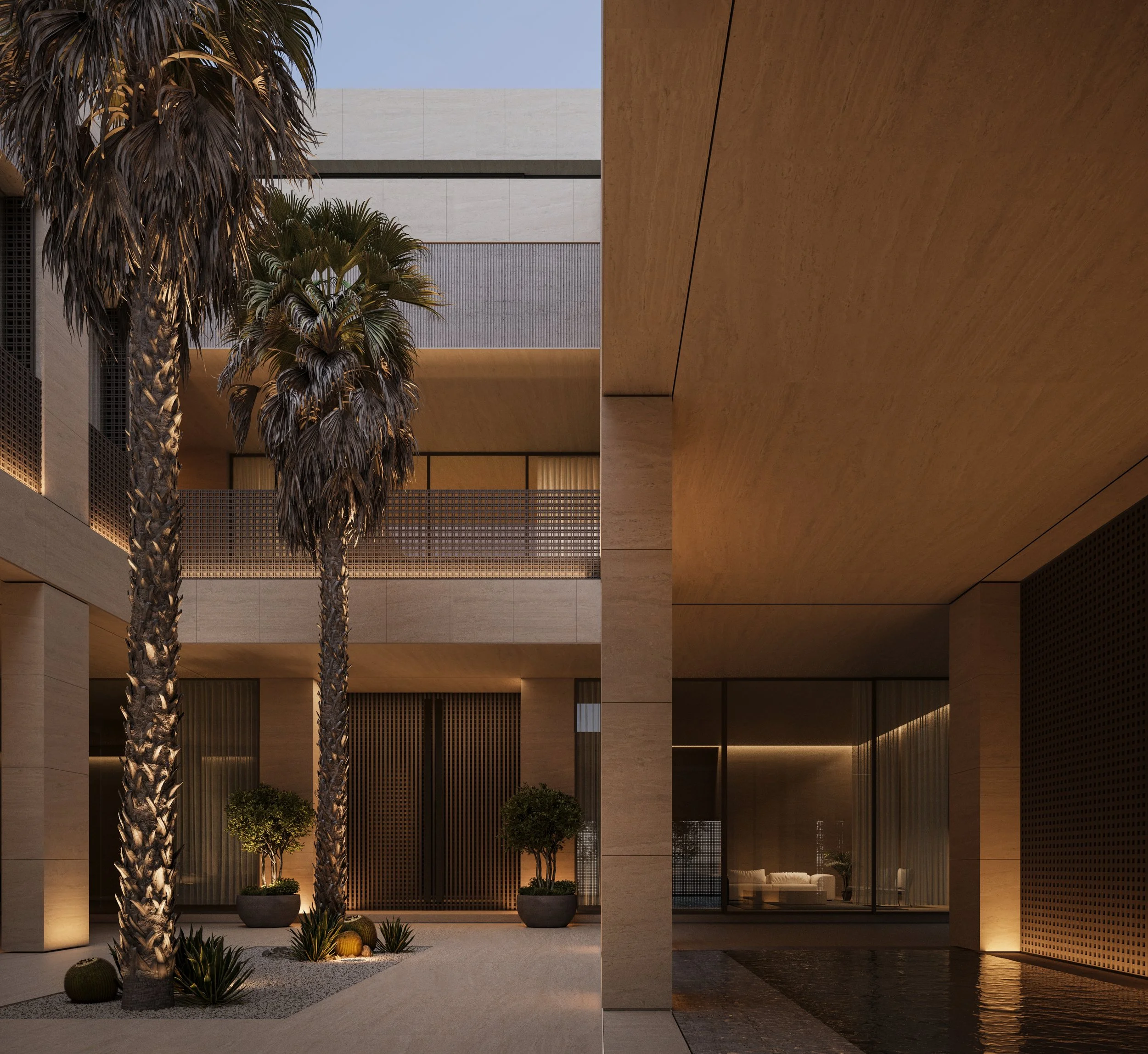 If Twin House is about reflection, Bait Hilal is about embrace. Designed around a crescent-shaped plan, the house curves protectively around its central garden, evoking the traditional courtyard house while making a thoroughly contemporary statement.
